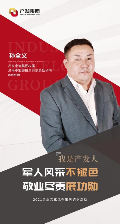 孫全義,現(xiàn)任產(chǎn)發(fā)企管集團權(quán)屬濟南市能源投資有限責任公司(以下簡稱“能投公司”)項目經(jīng)理。2001年參軍,在部隊期間刻苦訓(xùn)練,聽黨指揮,服從命令。2003年他從部隊光榮退役,隨后加入能投公司。期間曾借調(diào)至濟南市發(fā)改委幫助工作,現(xiàn)負責能投公司的資產(chǎn)管理工作。