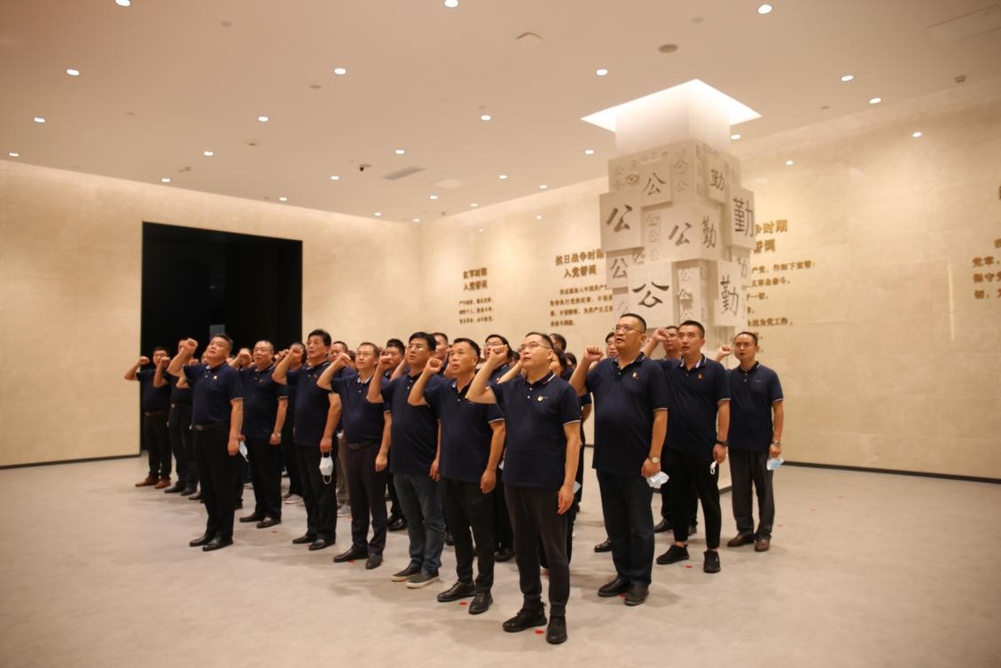 在宣誓廳,參觀人員面對(duì)鮮艷的黨旗重溫入黨誓詞,回憶感悟不忘初心、牢記使命的責(zé)任感。