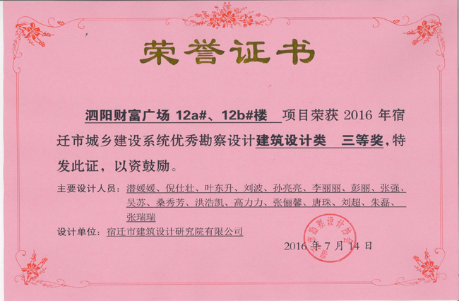 1、泗陽財富廣場12a#、12b樓項目中獲建筑設(shè)計類三等獎