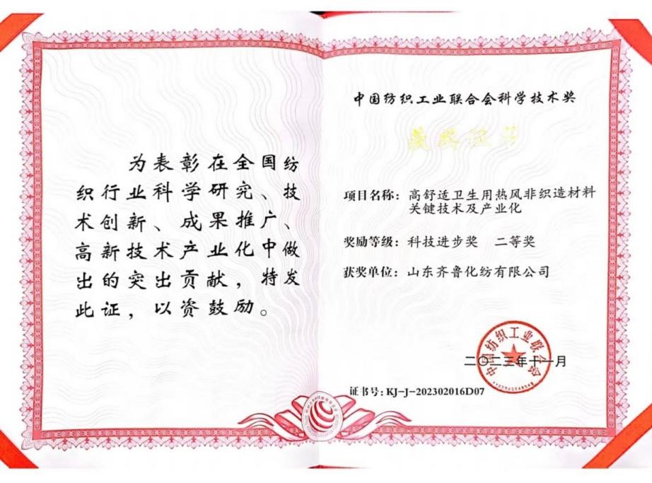 12月6日上午,2023年度中國紡織工業(yè)聯(lián)合會科學技術獎勵大會在北京人民大會堂隆重召開。齊魯化纖集團山東齊魯化紡有限公司與天津工業(yè)大學產學研團隊共同開發(fā)的“高舒適衛(wèi)生用熱風非織造材料關鍵技術及產業(yè)化”項目榮獲2023年度中國紡織工業(yè)聯(lián)合會科技進步獎二等獎,化紡公司副總經理唐元冰代表公司上臺接受表彰。